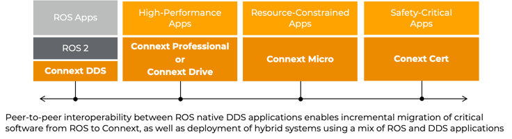 Connext provides fast and flexible prototype-to-production transition paths. This includes supporting incremental migration of critical applications from ROS to native Connext DDS interfaces for higher performance, better scalability, reduced resource consumption, and easier safety assurance.